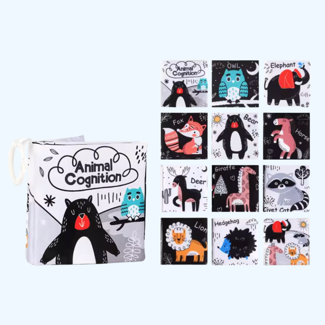 Babies don’t see the world like we do — that’s why this book was designed just for them. With bold black-and-white contrast, friendly animal illustrations, and soft fabric pages, this early learning cloth book stimulates visual development, focus, and cognitive growth in the first critical months of life.